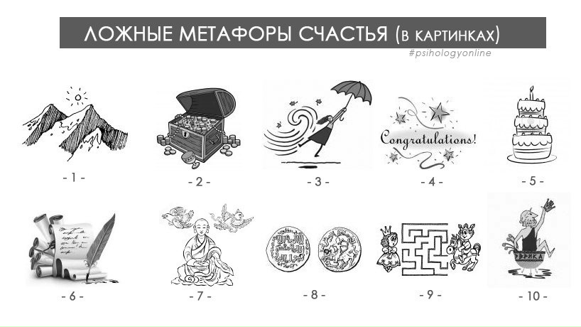 Распространенные взгляды на счастье в картинках, соотнесенные с тем, что мы знаем о нем из современных психологических исследований и концепций. 1) Счастье как вершина горы.- Нечто, к чему нужно стремиться, что необходимо достичь.Сама идея «стремления к счастью» — лучшая иллюстрация этой метафоры. Одним из ее следствий является представление о том, что счастье – это нечто внешнее, что это объект, а не самоощущение. Чтобы избежать двусмысленности и неопределенности в психологии сегодня используется в качестве более строгого термин: «субъективное благополучие». 2) Счастье как спрятанный клад.- Его надо искать и найти.Эта метафора также содержит скрыто в себе идею «потерянного рая» — чего-то прекрасного, чем мы обладали (в детстве, предыдущих отношениях, на предыдущей работе) и что утратили. В этой связи, как полагают психологи, более предпочтительной метафоре потери-нахождения является метафора выстраивания или выращивания. Другими словами, лучше относиться к счастью как к цветку, который мы культивируем и растим. 3) Счастье как ветер перемен.- Мы ждем его и надеемся, что вместе с изменениями обстоятельств жизни, придет долгожданное изменение в нашем переживании.Многочисленные исследования в области позитивной психологии показывают, что это неоправданные ожидания. В список того, что не меняет стабильного ощущения счастья входит, например: продвижение по службе, собственное жилье, больше денег, больше времени, красивая фигура, здоровье, выигрыш любимой команды, победа предпочитаемого кандидата в президенты на выборах и т.д. 4) Счастье как удача.- Если Вы баловень судьбы – Вы более счастливы.Этот миф развеивает, в частности, известное исследование Филиппа Брикмана, показывающее как быстро мы адаптируемся к большим удачам и неудачам в своей жизни. Люди, выигравшие лотерею, и люди, прикованные к коляске после автокатастрофы – в конце концов, возвращаются к исходному личному уровню счастья-несчастья. (У первых это занимает в среднем месяц, у вторых – около года.) 5) Счастье как лакомство.- Быть счастливым – значит жить максимально полной удовольствиями жизнью.Культ наслаждения и ярких эмоций – одна из самых древних, соблазнительных и убедительных философий жизни. О ее односторонности и уязвимости говорили мыслители прошлого. Сейчас на это указывают исследования: количество и острота удовольствий не способствует повышению уровня счастья. Наша гонка за ними часто является попыткой заполнить внутреннюю пустоту, вызванную отсутствием важной составляющей счастья: смысла. 6) Счастье как наследство.- Если у нас было несчастное детство или юность, мы не скопили или обанкротили свой психологический капитал – не стоит ждать счастья в будущем.Это представление имеет весомые психологические основания – мы совсем не всегда способны сами вытащить себя из бесконечного перемалывания неудач прошлого и движения по кругу. Для этого исторически сформировался целый институт – психотерапии. В то же время, прошлое не предопределяет однозначно наше будущее, векторы развития и ощущение счастья. И важно это не забывать. 7) Счастье как непрерывное блаженство.- Образ, который достался нам из литературы, кинематографа и древних сказаний о людях, которые испытали драму, внутреннее преображение и затем стали счастливыми.Это представление не дает нам в