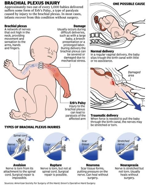Опубликовал в своём блоге популяризатор науки, врач-педиатр Сергей Бутрий: Вот приносили новорождённого с параличом Дюшена-Эрба, повторял матчасть, давайте и вам расскажу. § Что это? Травмы плечевого нервного сплетения (brachial plexus injury, далее ТПНС), также называемые неонатальным параличом плечевого сплетения (neonatal brachial plexus palsy) поражают в среднем 1-2 из каждой 1000 новорождённых детей, и являются одними из самых частых родовых травм. Плечевое сплетение - это группа нервных стволов, которые проходят от позвоночника - под ключицей - через подмышечную впадину - по внутренней стороне плеча - и дальше в руку. § В чем причина таких травм? Одной из наиболее распространенных причин развития ТПНС у младенцев является чрезмерное растяжение и/или сдавление плечевого сплетения во время родов. В большинстве случаев речь идет о стрессовых и сложных родах, особенно тех, в которых используется наложение акушерских щипцов или вакуумного инструмента. § То есть виноваты акушеры? Так я и знал(а)! Мы же просили кесарево! Это очень инфантильная и несправедливая позиция. Акушеры не от хорошей жизни иногда выбирают агрессивные методики экстренного родоразрешения, а по очень серьёзным или даже жизненным показаниям (выбор может стоять между жизнью плода/матери и щипцами); кесарево сечение - это тоже не молнию на сумке расстегнуть, это серьёзная операция со своими рисками. Так что опасайтесь примитивных суждений и категоричных вердиктов, они почти всегда несправедливы. Помимо травматичных методик родоразрешения, факторами риска травм плечевого сплетения являются: - роды в ягодичном предлежании - крупный вес и длина ребёнка (макросомия плода) - вклинение и застревание плеч младенца в тазовой области матери более 1 минуты (дистоция плечиков) - диабет у матери - недоразвитие мышц шеи - ожирение у матери. Травма плечевого сплетения может возникнуть, если врач применит чрезмерное давление или вытягивание ребенка во время самопроизвольных родов. Например, когда головка ребенка уже вышла, но плечи вклинились в тазовую область матери. В таком случае возникает угроза асфиксии ребенка, или развития другого опасного медицинского осложнения - и врачу приходится выводить плечико, прикладывая чрезмерное усилие. Это может привести к разрыву или растяжению плечевого сплетения, перелому ключицы и другим травмам, однако у врача в такой ситуации нет другого выбора, кроме как "из двух зол меньшее". В некоторых случаях чрезмерно интенсивные схватки могут привести к травмам плечевого сплетения. Если роды затягиваются и ребенок застрял в родовом канале, схватки матери могут вызвать чрезмерное давление на голову и плечи ребёнка, что также может приводить к синякам, разрывам и переломам. § Какие виды травм плечевого сплетения бывают? Есть несколько типов травм плечевого сплетения, одни из них более распространены и менее опасны, другие встречаются реже, но часто оставляют стойкие неврологические дефекты. Нейрапраксия Нейрапраксия - наиболее распространенный и наименее тяжелый тип травмы плечевого сплетения, он характеризуется незначительными сдавлениями или разрывами в нервах. Повреждения при нейрапраксии затрагивают только оболочку нерва, а сами проводящие пути не поражаются. Тем не менее, нейрапраксия может причинять боль и дискомфорт, пока не разрешится. Симптомы нейрап